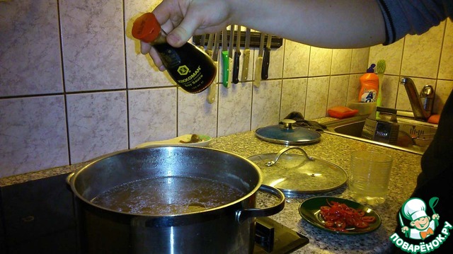 Кидаем в уже кипящий мисо суп, несколько колечек перца чилли, будьте аккуратны перец очень острый.