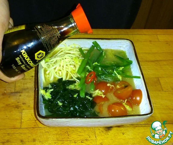 Залить наш рамен мисо супом с перцом чили и лаймом, и конечно же довести блюдо до умопомрочительного вкуса соевым соусом KIKKOMAN.