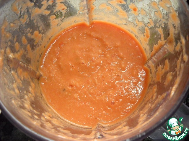 Теперь закладываем в блендер порезанные помидоры, чеснок, имбирь и лук. С помощью блендера превращаем наши овощи в однородное пюре. Воду добавлять не надо.