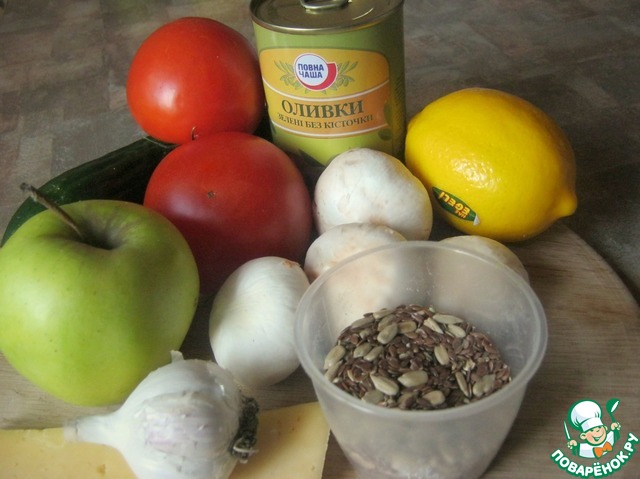 Нарезаем яблоки, помидоры, грибы и огурец, мелко рубимчеснок