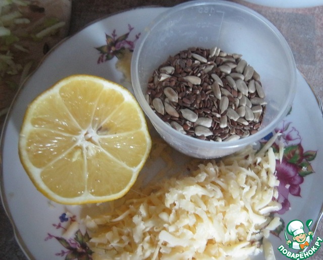 в масло выдавливаем лимон, добавляем чеснок, семечки