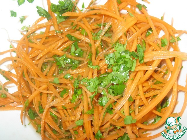 Морковь потереть на тёрке для корейской моркови, добавить зелень, уксус, воду и сахар. Дать постоять.