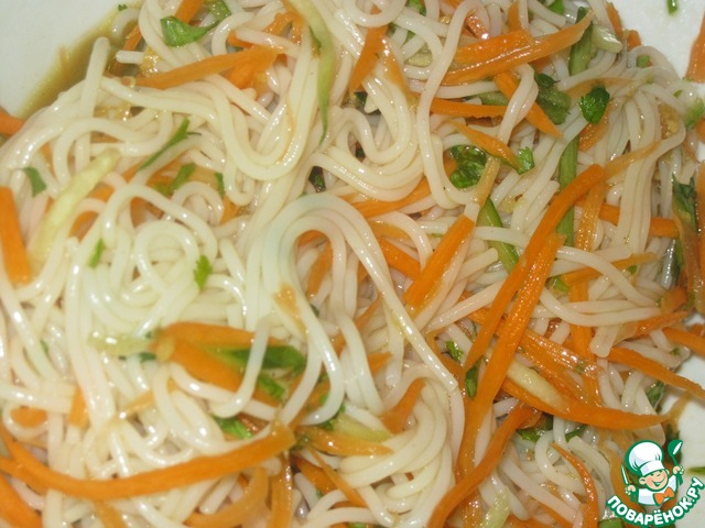 Морковь отжать, добавить нарезанный огурец, лапшу и заправку.