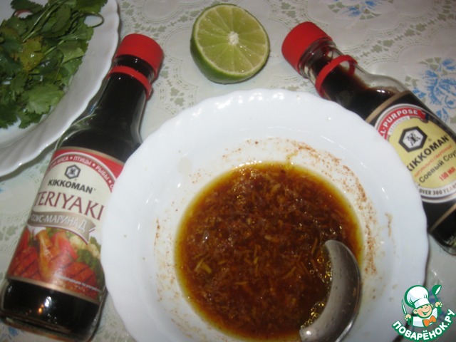 Смешать ингредиенты для заправки: терияки, соевый и вустерский соусы, имбирь, чили, чеснок, сок лайма, масло растительное. Дать настояться.