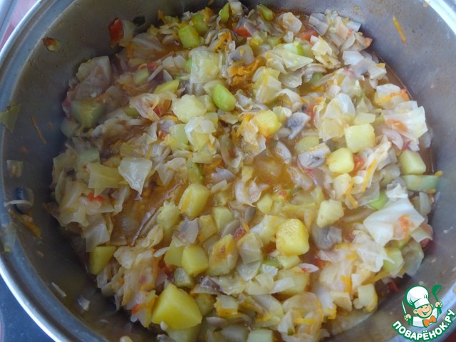 Наша капуста к этому времени должна быть готовой. Если она стала мягкой, снимаем с плиты и смешиваем со всеми, уже готовыми овощами. Можно добавить зелени по вкусу. Приятного всем аппетита!