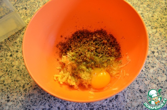 Натереть на терке картофель, смешать его с зеленью, яйцом и гречкой (воду слить).