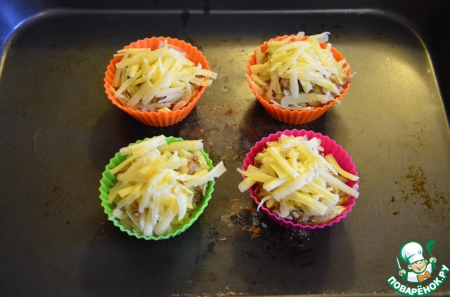 Разложить по формам, посыпать сыром, выпекать 180С 40 минут