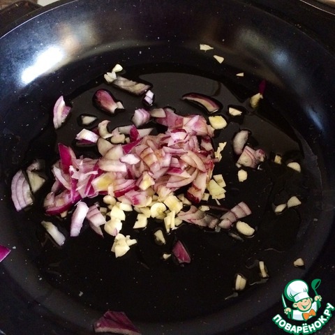 Мелко режем чеснок, лук и пассируем пару минут в оливковом масле.