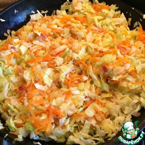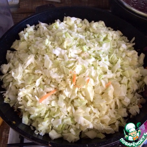 Пока пассируется морковь, лук, чеснок, режем капусту мелко и закидываем к зажарке