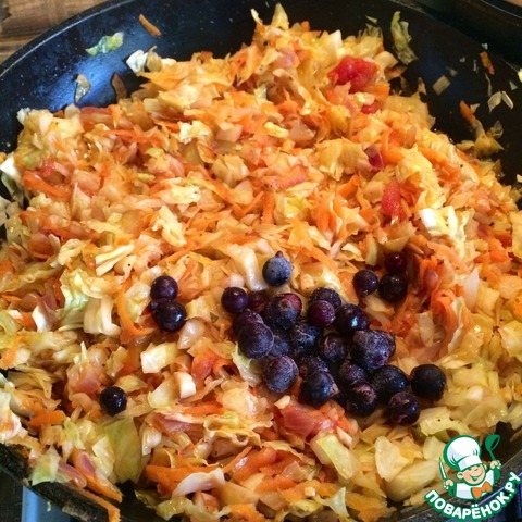 Когда капуста почти готова добавляем к ней мороженые ягоды ( сегодня у меня черная смородина). С красной смородиной или клюквой тоже очень вкусно.
