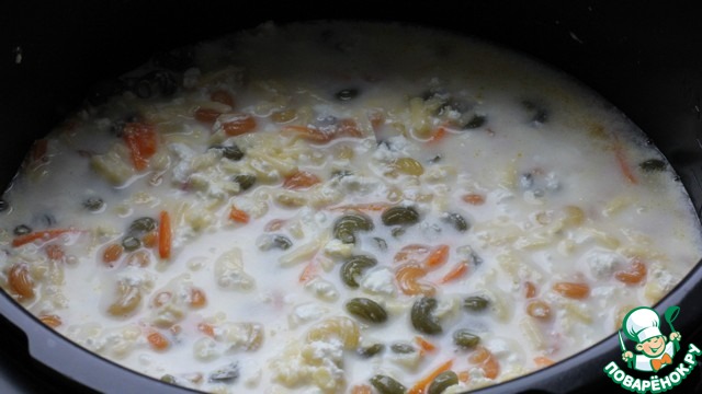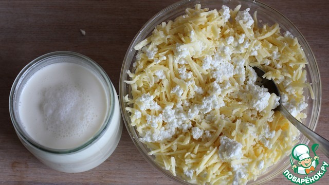 Пока готовятся овощи творог смешиваем с сыром, натёртым на крупной тёрке, а сливки разводим водой и добавляем соль.