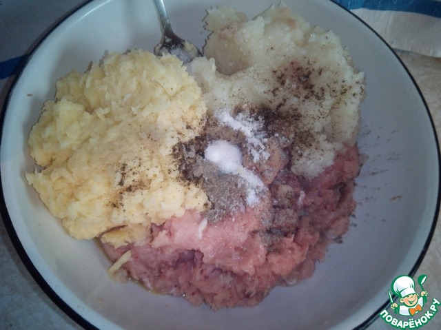 В полученный фарш добавляем овощи и специи. Соль, перец на глазок.
