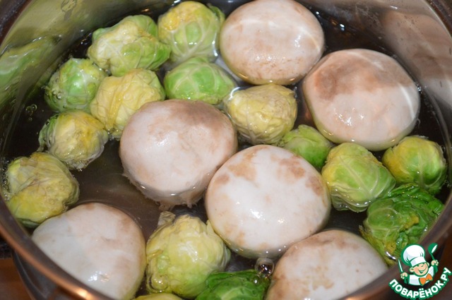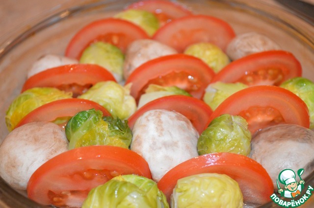 | Простое, легкое блюдо из запеченых овощей и грибов. При желании брюссельскую капусту в блюде можно заменить на брокколи. |