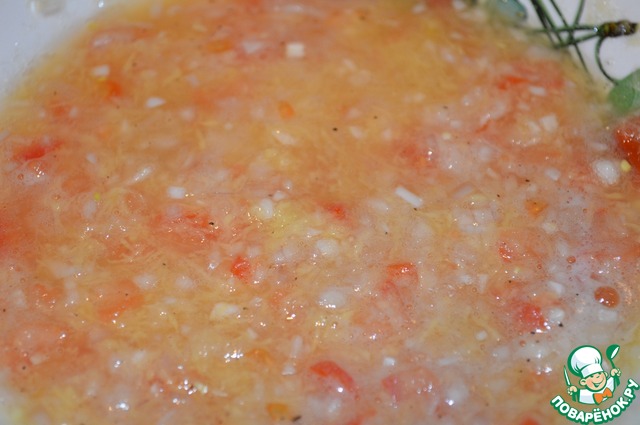 Для соуса на мелкой терке натереть сырой картофель, лук, чеснок и половинку помидора измельчить. Залить все половиной стакана отвара, поперчить по вкусу.