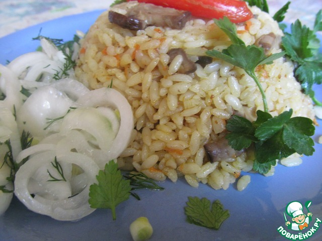 | Рис в сочетании с грибами получается нежный, рассыпчатый. К этому блюду я приготовила еще маринованный лук с соевым соусом. |