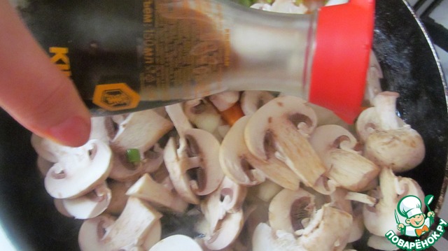 2. Обжарить все на растительном масле, добавить соль, перец, специи для плова и соевый соус kikkoman 2 ст. л.