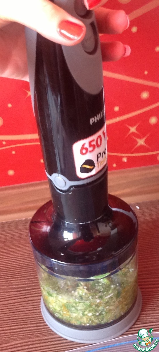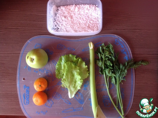 Зелень нашинковать, яблоко и сельдерей нарезать кубиками, мандарин разделить на дольки