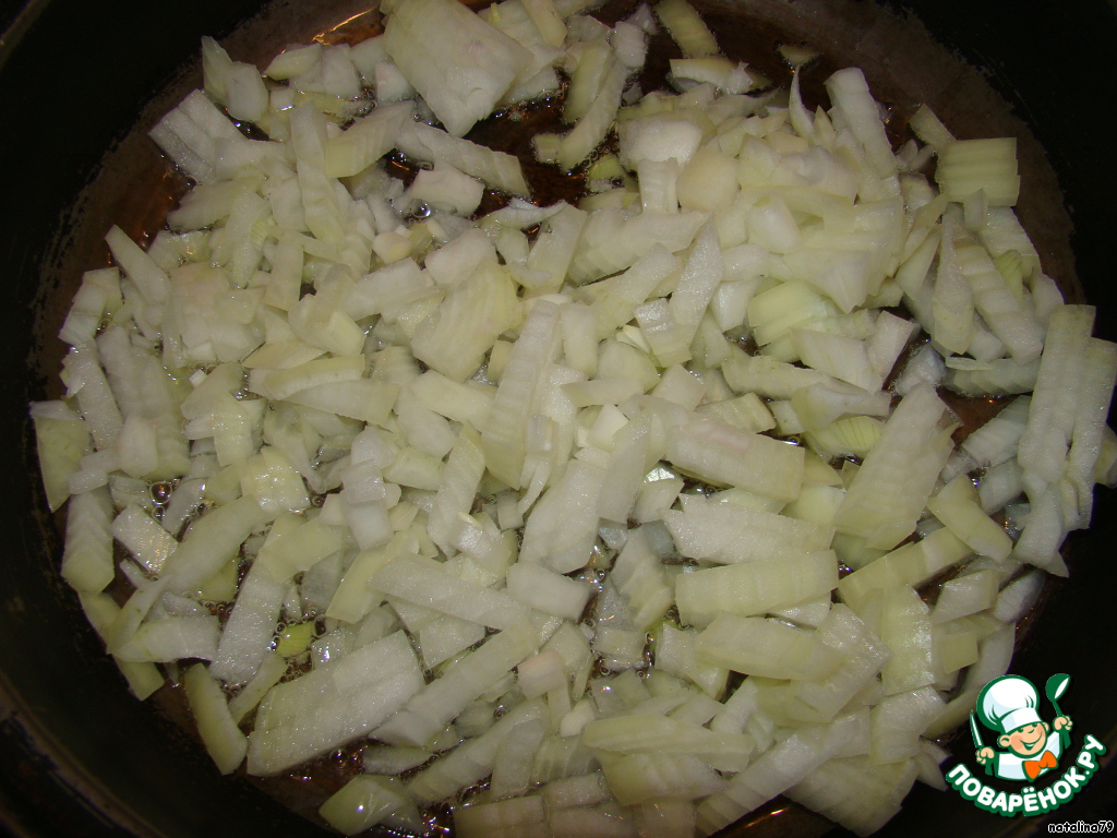 Лук нарезаем мелким кубиком и обжариваем на растительном масле до слегка золотистого цвета. Сильно зажаривать не стоит.