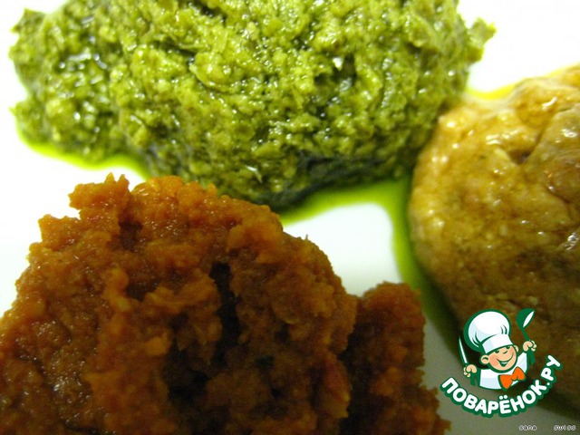 С помощью мраморной ступки и деревянного пестика или (более упрощенный вариант) в блендере измельчаем базилик, орешки (или семена пинии), чеснок, сыр, вяленые томаты. По желанию, можно добавить каперсы и бальзамический уксус (но это не обязательные ингредиенты).