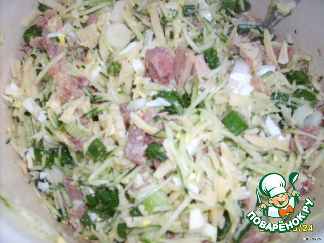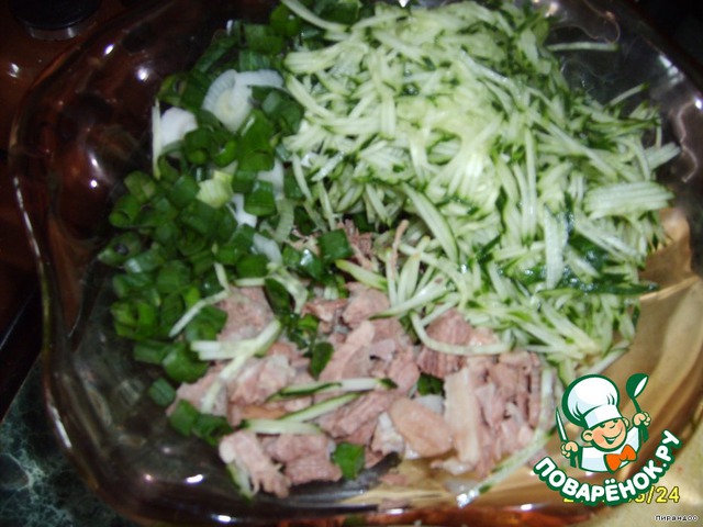 Как всегда, к середине приготовления я опомнилась и решила всё это дело сфоткать. Поэтому в салатнике уже нарезанное кубиками мясо, лук и огурец, тертый на тёрке для корейской морковки.