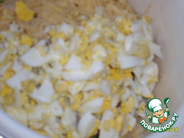 Отварные яйца режем не очень мелко, тоже добавляем