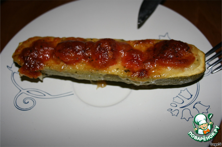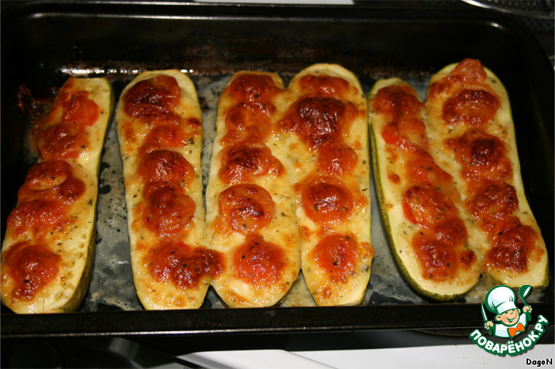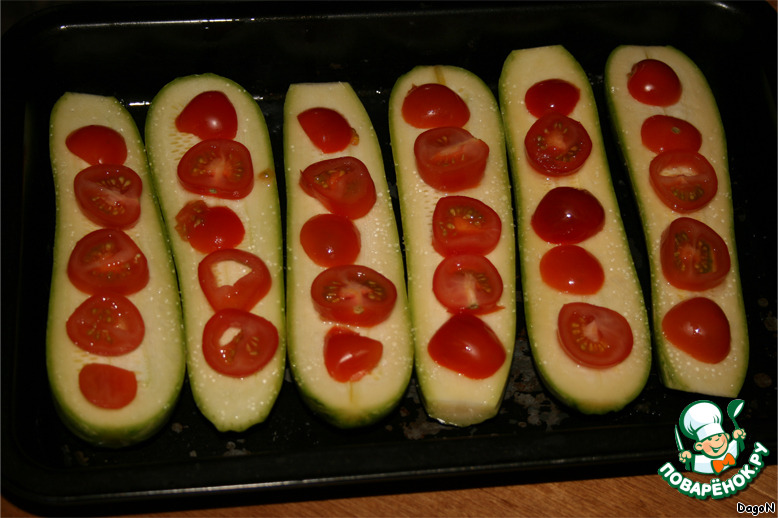 Выложить кабачки на противень. Сверху положить нарезанные кружочками помидоры