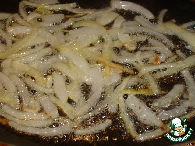 Репчатый лук нарезать полукольцами и обжарить на растительном масле.