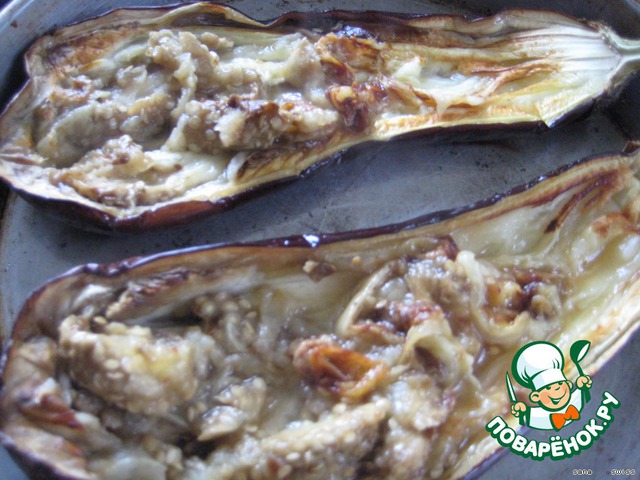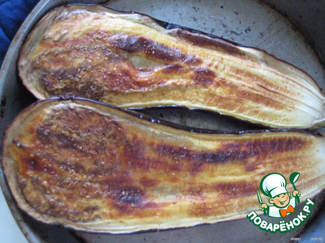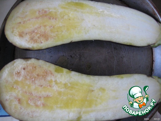 баклажан разрезать вдоль на 2 части, смазать оливковым маслом и запечь в духовке 20 мин. (180°C)