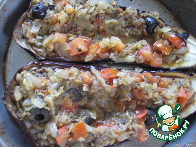 добавить измельченную сердцевину баклажана, посолить, поперчить, потушить 2-3 мин., добавить оливки и зелень и выложить этот фарш в половинки баклажанов.