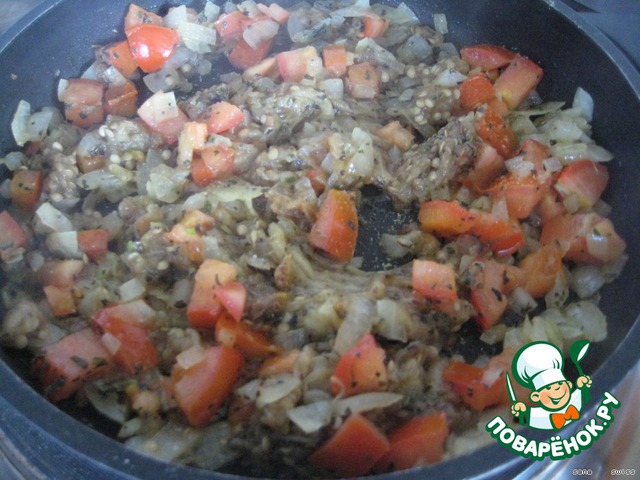 На разогретой сковороде с добавлением масла, потушить лук, помидоры (5-7 мин.),