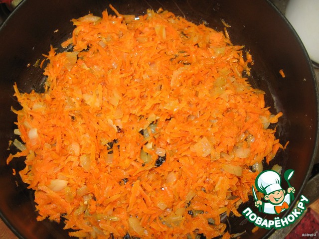 Лук порезать, морковку на крупную терку, пассеруем на растительном масле.