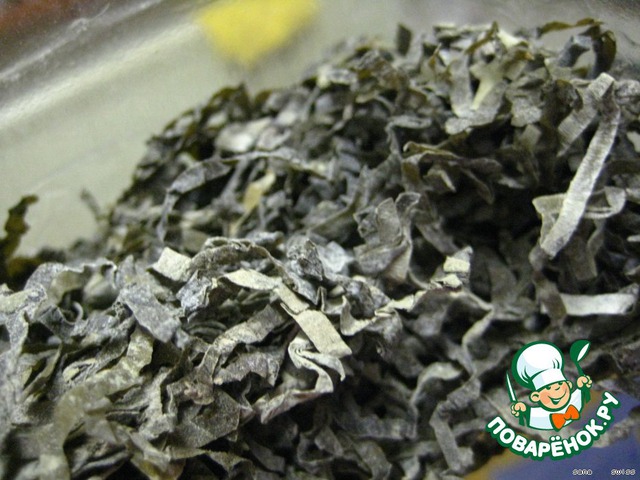 Сушеную морскую капусту замочить в холодной воде часов на 12;
