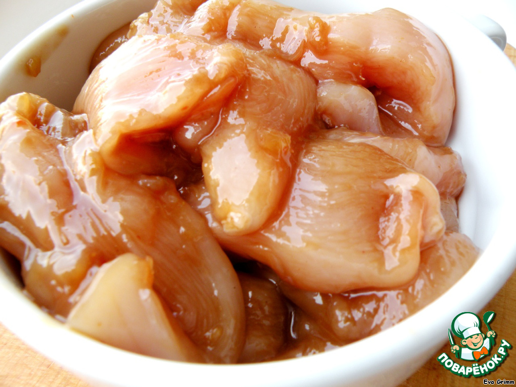 Сразу займемся куриным филе. Замаринуем полоски в соевом и экзотическом соусе. Поставим в холодильник мариноваться.