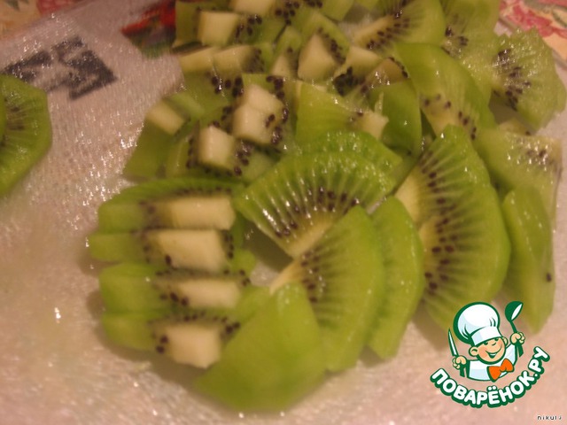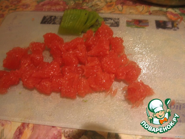 Куриную грудку порезать тоненько, полить соевым соусом, оставить промариноваться(я на 1 час оставляю).Обжарить , охладить и порезать соломкой.Капусту тонко нашинковать. Грейпфрут очистить от кожицы и пленочек, порезать кубиками, киви небольшими ломтиками.