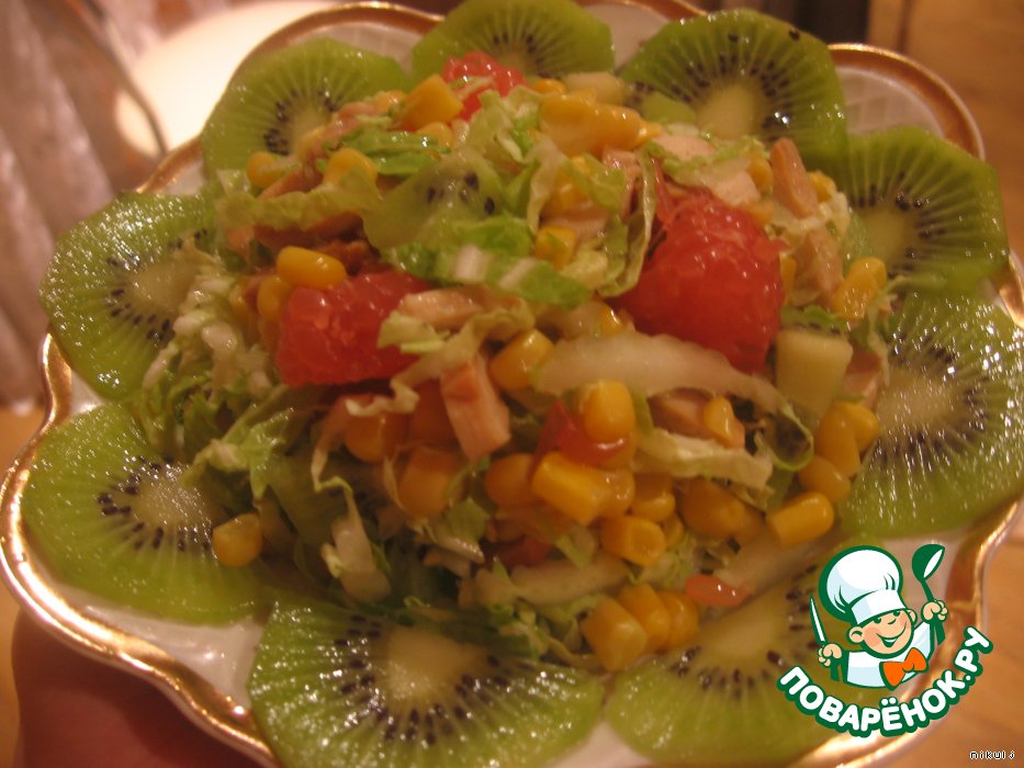 Смешать капусту, киви, грейпфрут, кукурузу, курицу, полить оливковым маслом и лимонным соком, по желанию можно заправить майонезом. Салат получается очень вкусным и сочным, не сладким, а даже с легкой кислинкой. Хорошо подойдет тем, кто следит за фигурой. Приятного всем аппетита!!