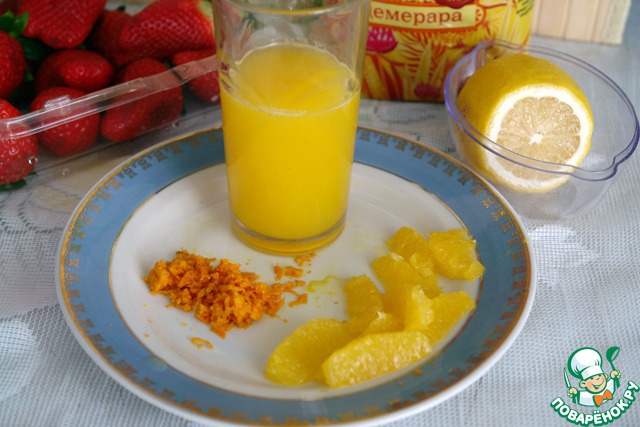 Апельсиновый сок смешать с соком от 1/2 лимона, добавить 100г сахара и 150 мл. воды, довести до кипения.