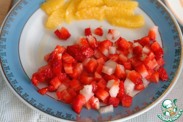 Клубнику нарезать кубиками, не очень мелко, пару ягодок оставить для украшения.