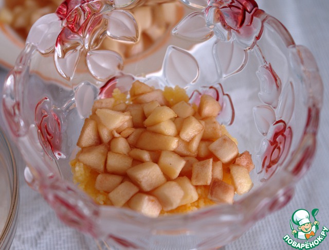 Затем часть яблок, опять кус-кус, и часть груш.