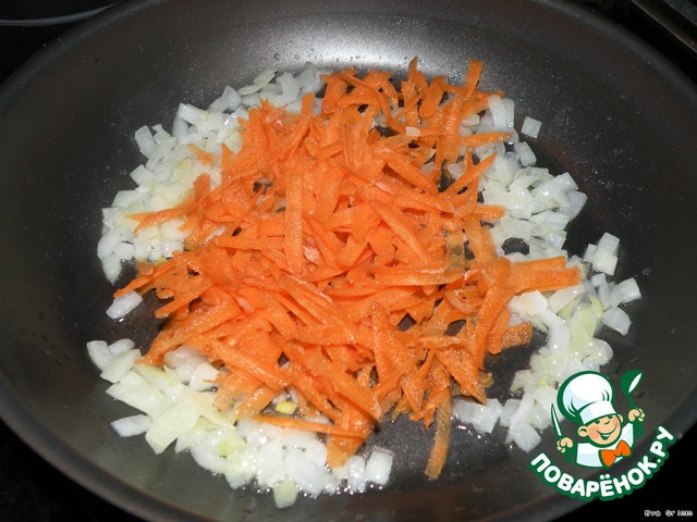 Морковь натереть на терке, потушить с маслом на сковороде. Лук мелко нарезать и добавить в почти готовую морковь, спассеровать.