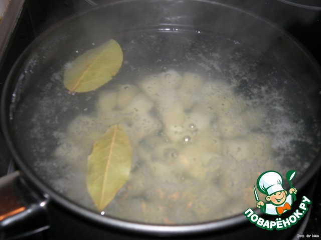 В кипящую воду опустить нарезанный брусочками картофель и лавровый лист.
