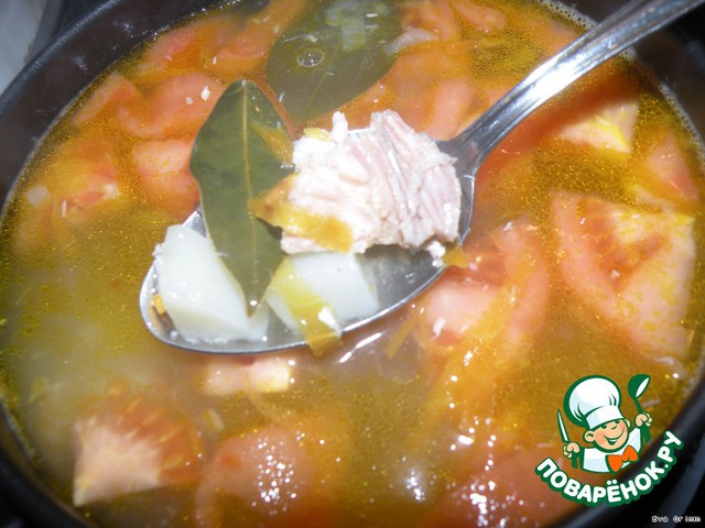Добавить в суп за 5 минут до готовности. После того как супчик настоится минут 15, томат почти растворится в бульоне (ну это по желанию конечно, на горячей плите погреется чуточку и томат искать в бульоне будете ;-) )