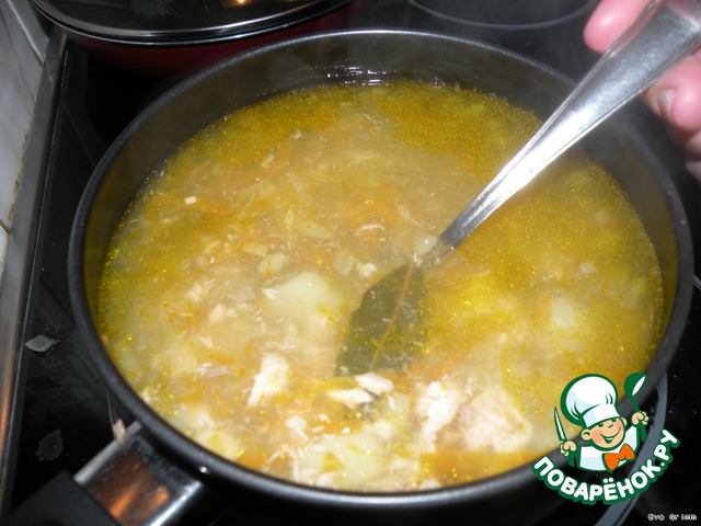 Полученную массу ввести в картофельный бульон, посолить. Консервированную рыбу разобрать на кусочки, удалить косточки, добавить в бульон.