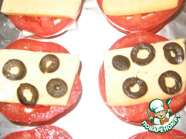 Выложить на смазанную растительным маслом поверхность ломтик помидора-брынзу-помидор-соль-сыр-нарезанную колечками маслину,поставить в разогретую духовку 200С на 15 мин. (подстраивайтесь под свою может и 10-20 мин.), вынуть, еще горячими взбрызнуть оливковым маслом с чесночком, украсить веточкой базилика. Можно запекать в СВЧ, 750-5-8 мин. Приятного аппетита!