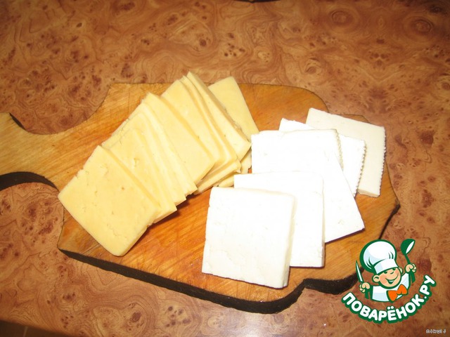 Сыр нарезать пластинками по величине помидора 4-5 мм. толщиной (сыр можно использовать любой, можно один вид, можно несколько).
