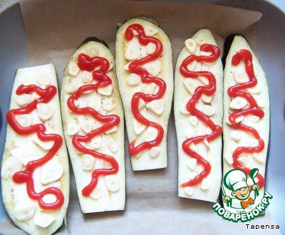 Поверх делаем что-то вроде змейки из кетчупа. Конечнo, лучше тонко нарезанные свежие помидоры, но у меня их не было.