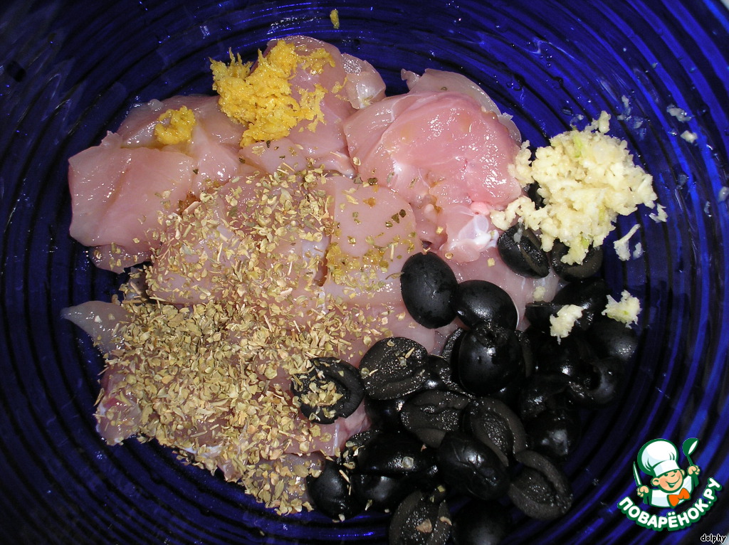В стеклянной или керамической посуде смешайте курицу, маслины, орегано, чеснок, масло и цедру лимона. Накройте пленкой и уберите в холодильник на 30 минут для раскрытия ароматов.