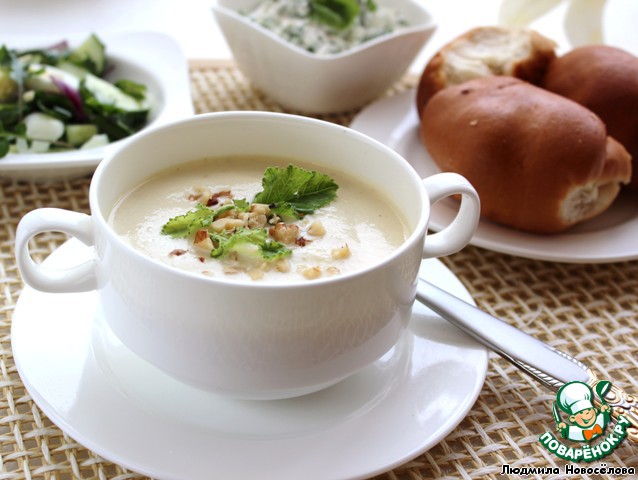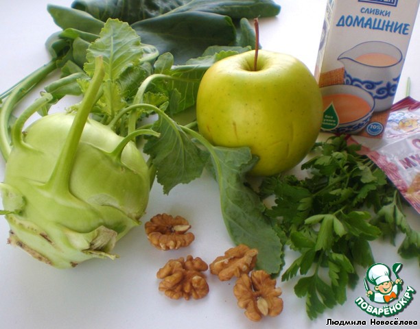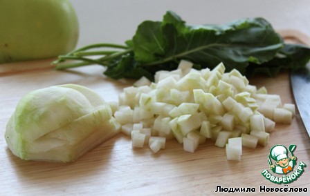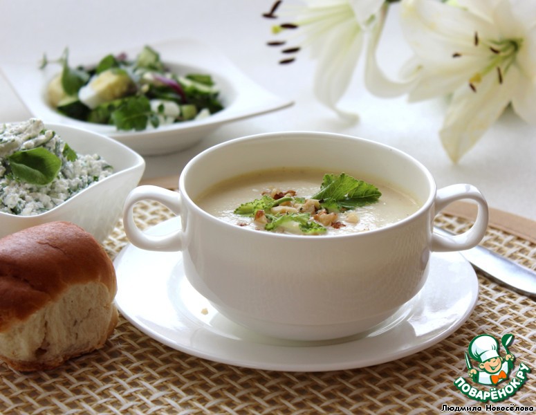 | На прилавках наших рынков стала часто появляться кольраби или "капустная репа", которая не только необыкновенно полезна, но ещe и очень вкусна. Из неe легко приготовить закуски, салаты, супы. У кольраби и "вершки", и корешки ценны, так как она буквально наполнена калием, кальцием, магнием, витамином С, клетчаткой. Оптимальный диаметр клубней кольраби - 8 см. Из белого, раннего кольраби получается нежнейший суп, который предлагаю подать с творожной закуской, салатом и пампушками. |