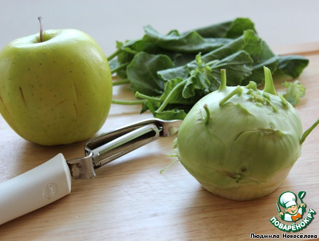 Яблоко и кольраби вымыть, молодые листочки отложить.