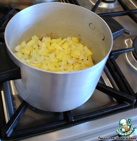 Сливочное масло распустить в сотейнике. Яблоко и кольраби потушить до мягкости 5-6 мин.