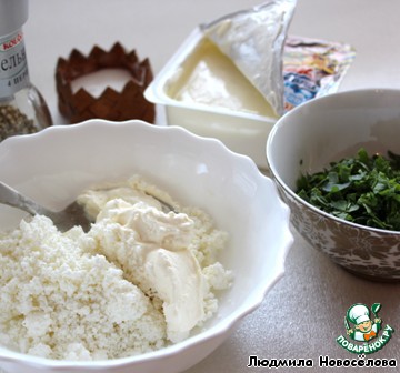 Творог смешать со сметаной, добавить зелень, посолить, поперчить.